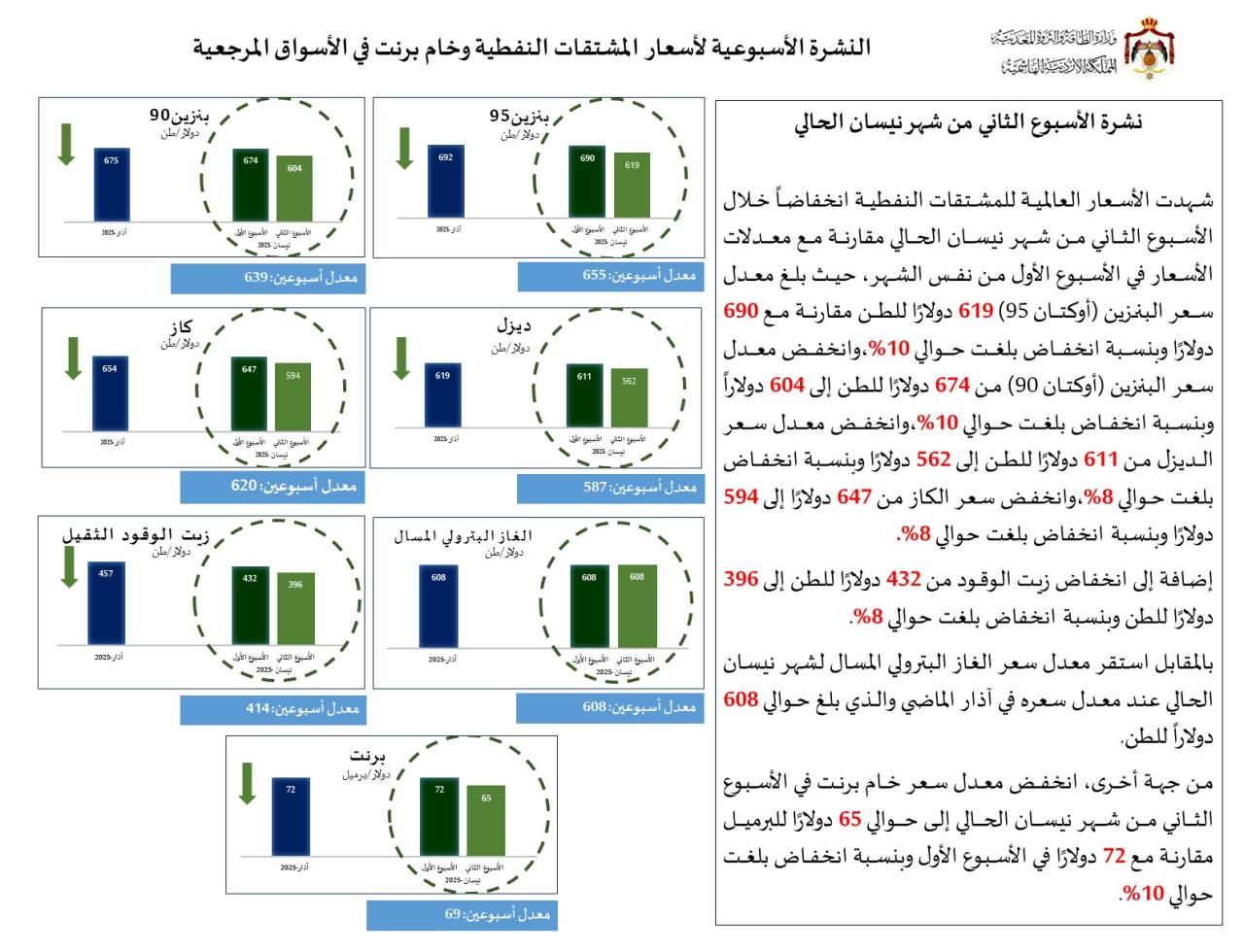 من جهة أخرى، انخفض معدل سعر خام برنت في الأسبوع الثاني من شهر نيسان الحالي إلى حوالي 65 دولارًا للبرميل مقارنة مع 72 دولارًا في الأسبوع الأول، وبنسبة انخفاض بلغت حوالي 10%.