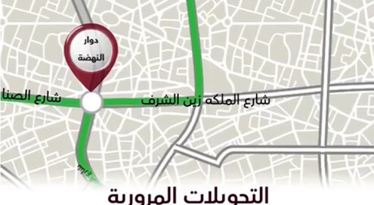 السير القادم من طريق المطار باتجاه الدوار الثامن يتم تحويله باتجاه السابع والقادم من الصناعة يتم تحويله لشارع الملكة زين والقادم من البيادر يتم تحويله باتجاه السابع.