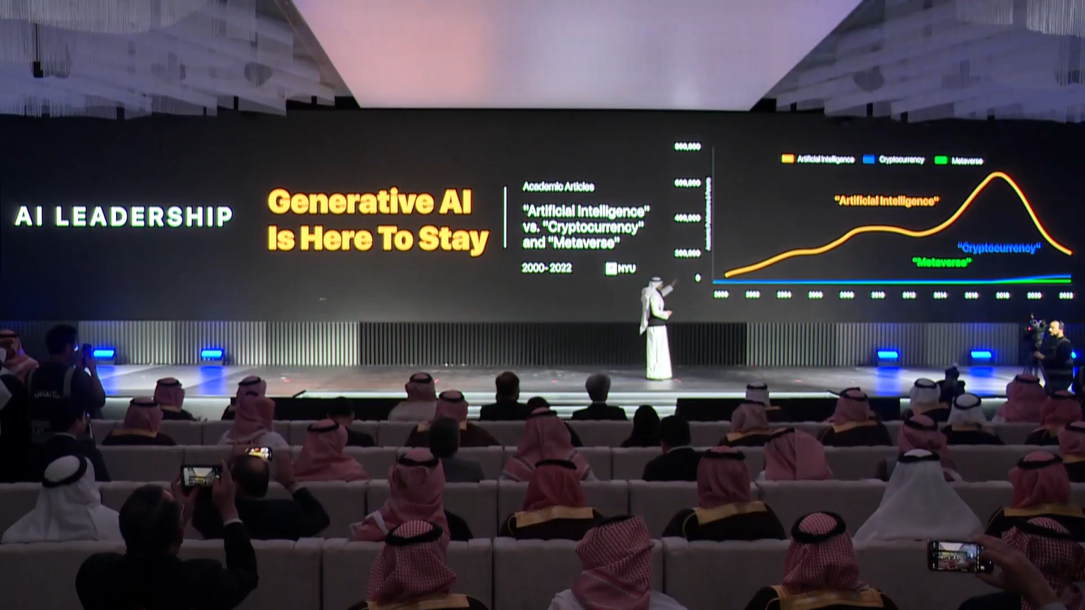 "في العام الماضي، أعلنَّا عن أكبر مسرِّع للذكاء الاصطناعي التوليدي، غاية، وهذا العام، قرَّرنا رفعَ تمويله إلى مليار دولار بالشراكة مع صاحب السمو الملكي [محمَّد بن سلمان آل سعود، ولي العهد ورئيس وزراء المملكة العربية السعودية]."