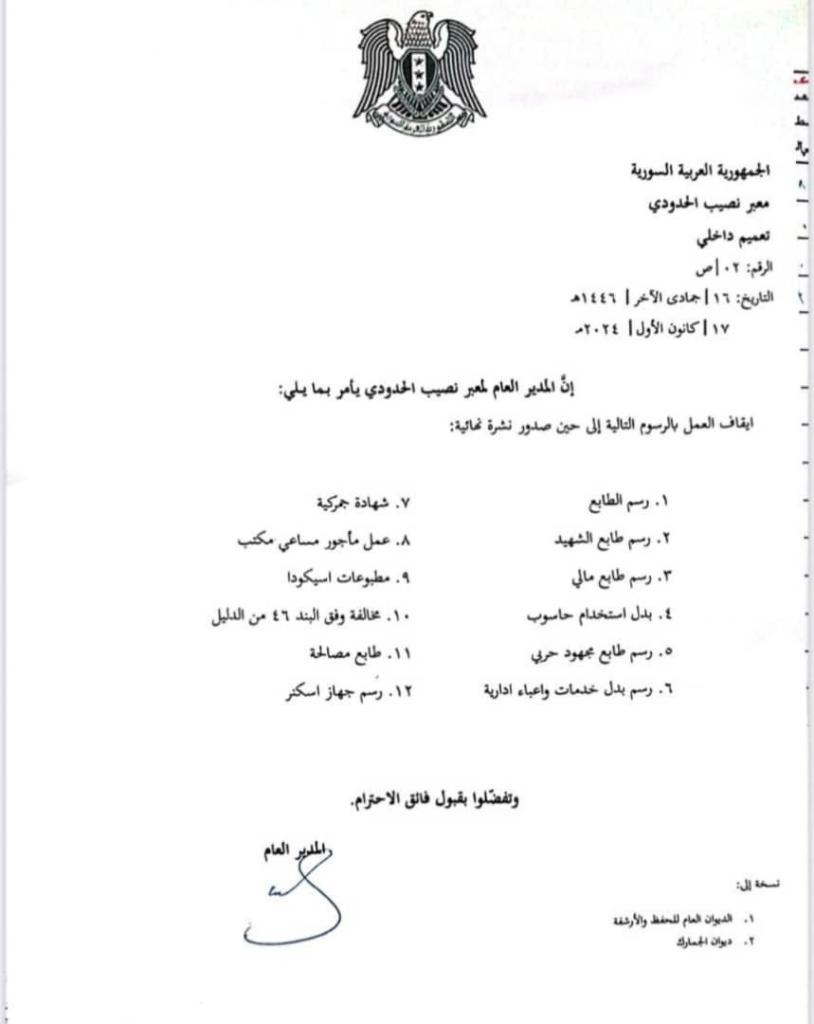 الجغبير:الجهات السورية قامت على إلغاء كافة جميع انواع الرسوم والطوابع
