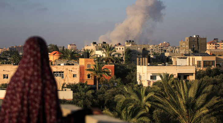امرأة فلسطينية تراقب تصاعد الدخان في أعقاب غارة للاحتلال في بلدة الزوايدة بوسط قطاع غزة