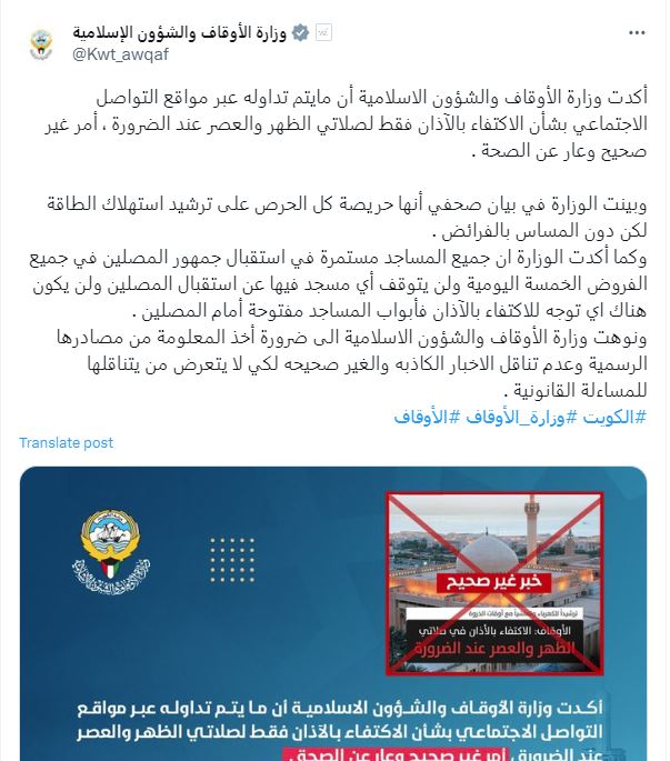 وجاء في المنشورات التي بدأت تنتشر في 21 حزيران/يونيو 2024 "الكويت: الاكتفاء بالأذان فقط فترتي الظهر والعصر ترشيداً للكهرباء".