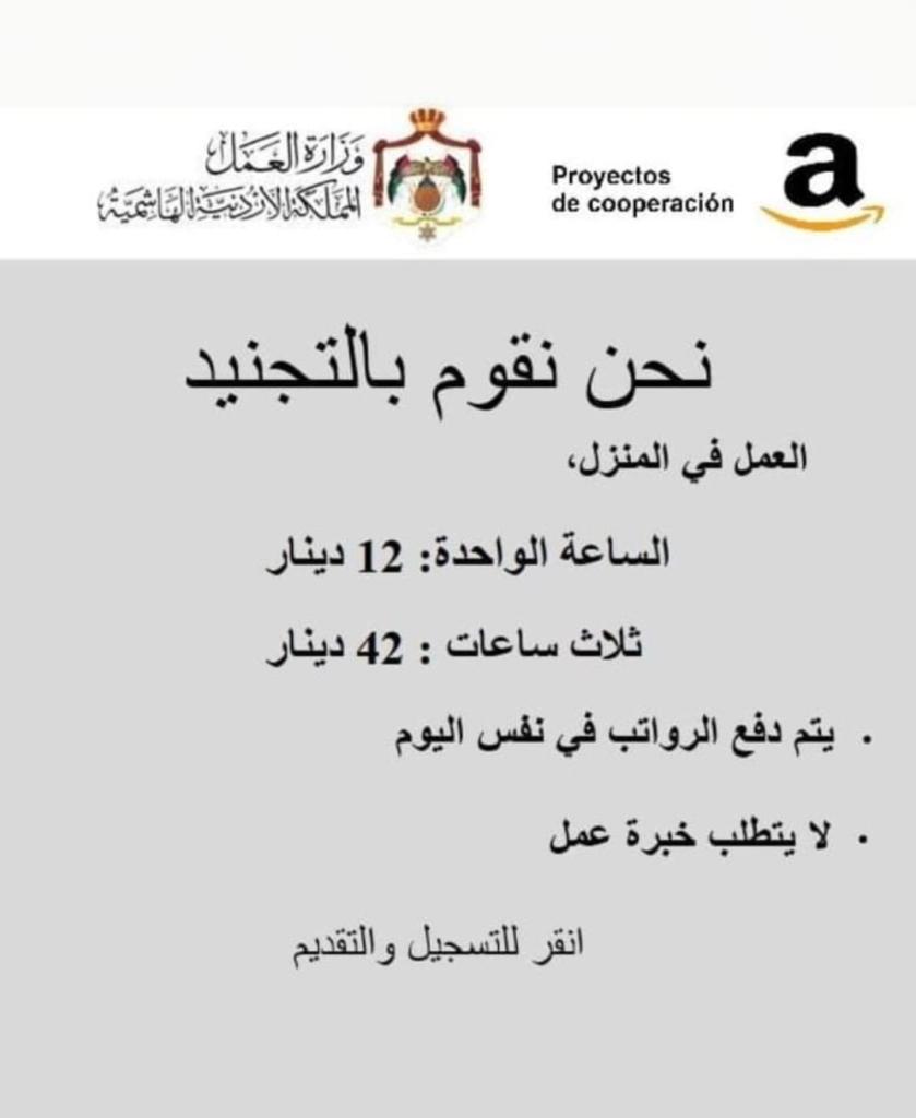 وتداول أردنيون إعلانا حمل شعار وزارة العمل جاء فيه: "نحن نقوم بالتجنيد. الساعة الواحدة بـ12 دينارا، وثلاث ساعات بـ42 دينارا. ويتم دفع الرواتب في نفس اليوم. ولا يتطلب العمل أي خبرة".