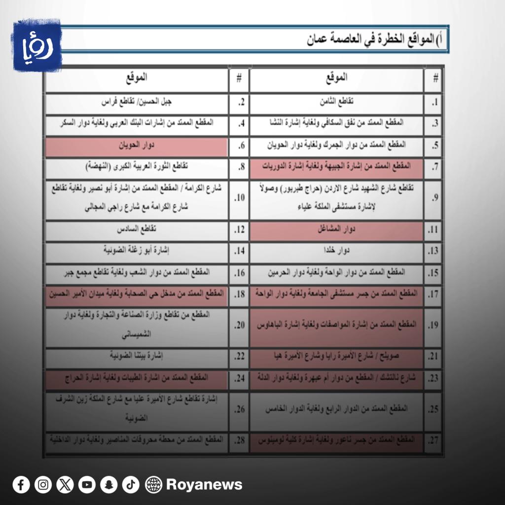 وأشار التقرير إلى أن هذه المواقع وقع فيها عدد من الحوادث المكافئة لحوادث الجرحى ولا يقل عن عشرين حادثًا في الأردن، وبحسب الأولويات التي تعتبر من أخطر المواقع وأكثرها وقوعًا للحوادث المرورية.