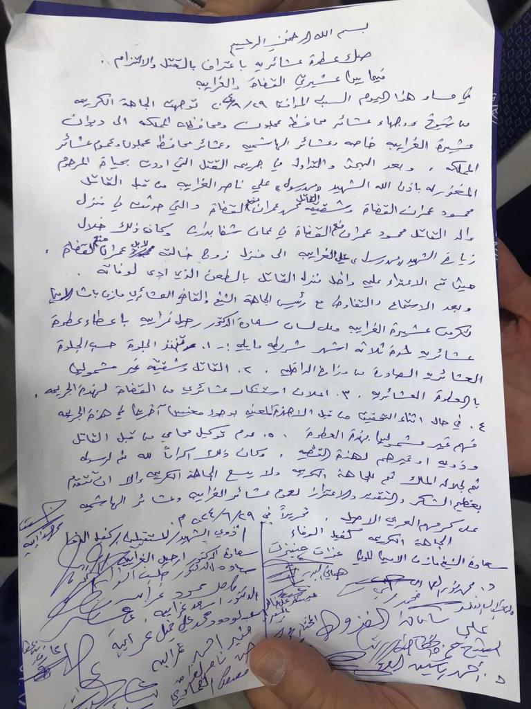 وقالت عشيرة الغرايبة إنها أعطت العطوةلمدة ثلاثة شهور إكراما لله ورسوله ولجلالة الملك والجاهة الكريمة، مؤكدة ثقتها الكاملة بالقضاء الأردني العادل لإحقاق الحق وايقاع عقوبة الإعدام على الجناة.