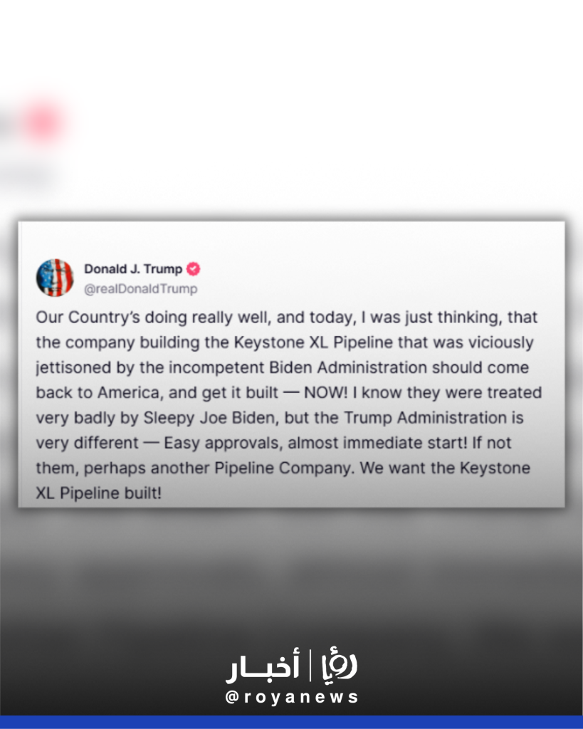وكتب ترمب في منشور له على منصته "تروث سوشل": "لقد لاحظت اليوم أنه يجب على الشركة الكندية التي كانت مسؤولة عن مشروع خط الأنابيب كيستون إكس إل الذي أوقفته إدارة بايدن، العودة إلى الولايات المتحدة وبدء العمل فيه فوراً!".