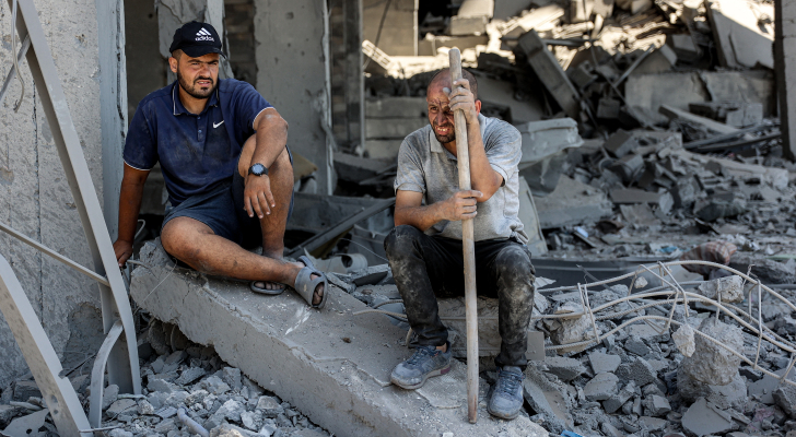 فلسطينيان يجلسان وسط الأنقاض في موقع مبنى تعرض لقصف الاحتلال في حي الصبرة جنوب مدينة غزة