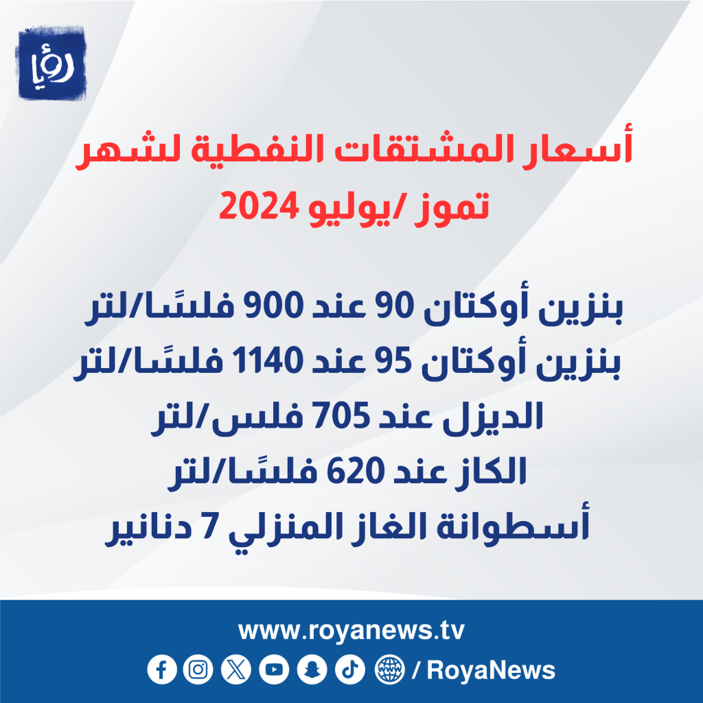 وبعد تطبيق المعادلة السعرية وفقا للأسعار العالمية على كافة المشتقات النفطية، تبين للجنة انخفاض سعر البنزين 90 بمقدار (15) فلساً/لتر، وانخفاض سعر البنزين 95 بمقدار (15) فلساً/لتر، وارتفاع سعر الديزل بمقدار (5) فلس/لتر.