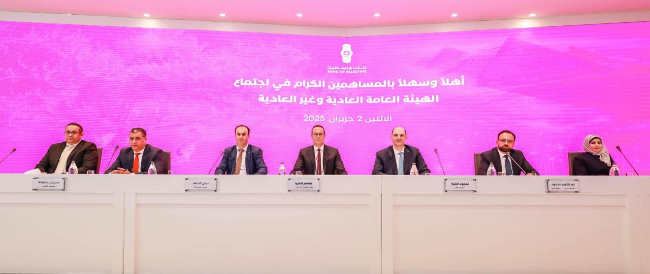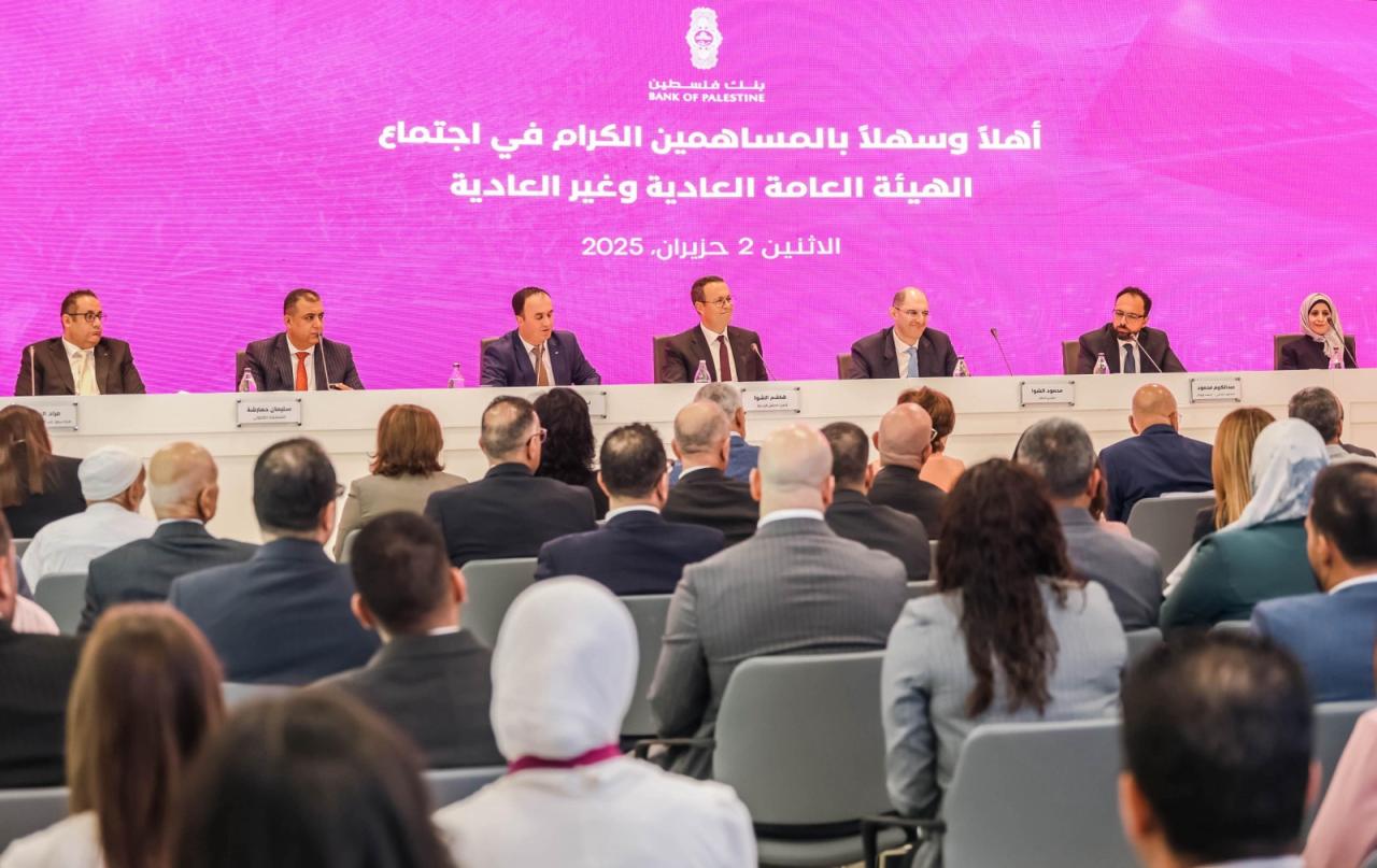 عقدت الهيئة العامة لبنك فلسطين اليوم الاثنين الموافق 2/6/2025، اجتماعها السنوي العادي وغير العادي في مقر المركز الرئيسي للإدارة العامة للبنك، بمدينة رام الله، وذلك بحضور السيد هاشم الشوا، رئيس مجلس الإدارة، والسيد محمود الشوا المدير العام، وأعضاء مجلس الإدارة، ومسجل الشركات في وزارة الاقتصاد الوطني، وممثلين عن المدقق الخارجي للحسابات، وسلطة النقد، وهيئة سوق رأس المال الفلسطينية، وعدد كبير من المساهمين بنصاب بلغ نسبته 74.97%.